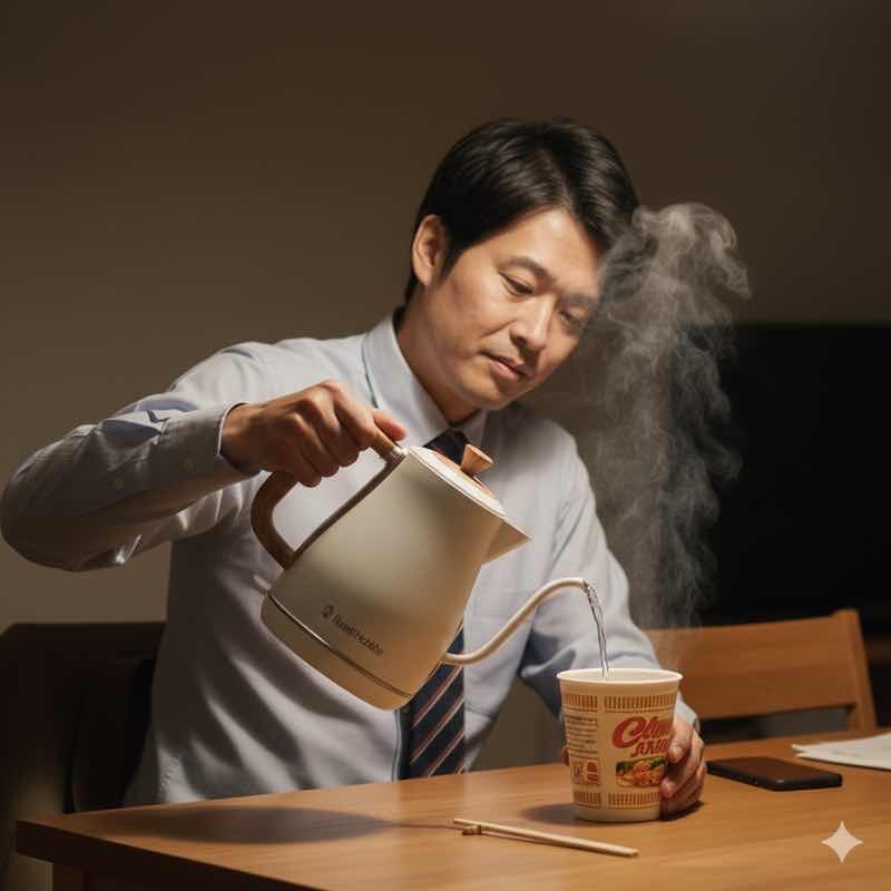 電気ケトルがなかった頃は、深夜に帰宅すると妻に「ご飯ある?」とLINEしていました。妻が眠い目をこすりながら起きて温めてくれる姿に、申し訳なさと情けなさを感じていました。コンビニ弁当が続き健康不安もあり、妻の睡眠を妨げる罪悪感も募るばかりでした。