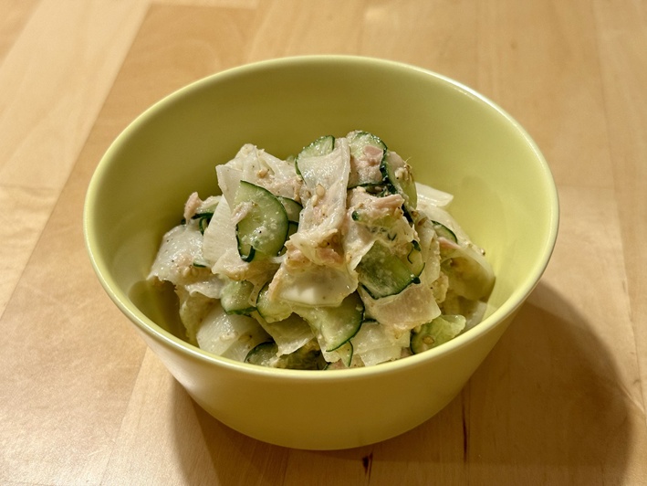 ボウルに大根・きゅうりを入れ、ツナ・めんつゆ・マヨネーズを加えてやさしく混ぜる。