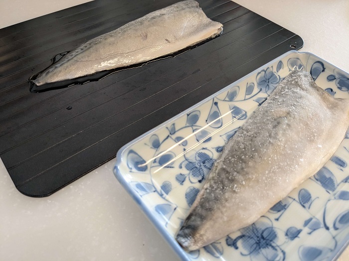下は比較対象としてお皿に置いただけのサバ。20分経過後も、まだお皿の上でツルツル滑るくらい凍っています。