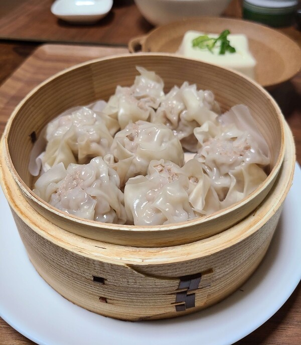 最初は妻が焼売を作ってくれました。ふっくらとジューシーに仕上がっていてとすごく美味しい!杉の香りがほんのりと漂い食欲をそそります。