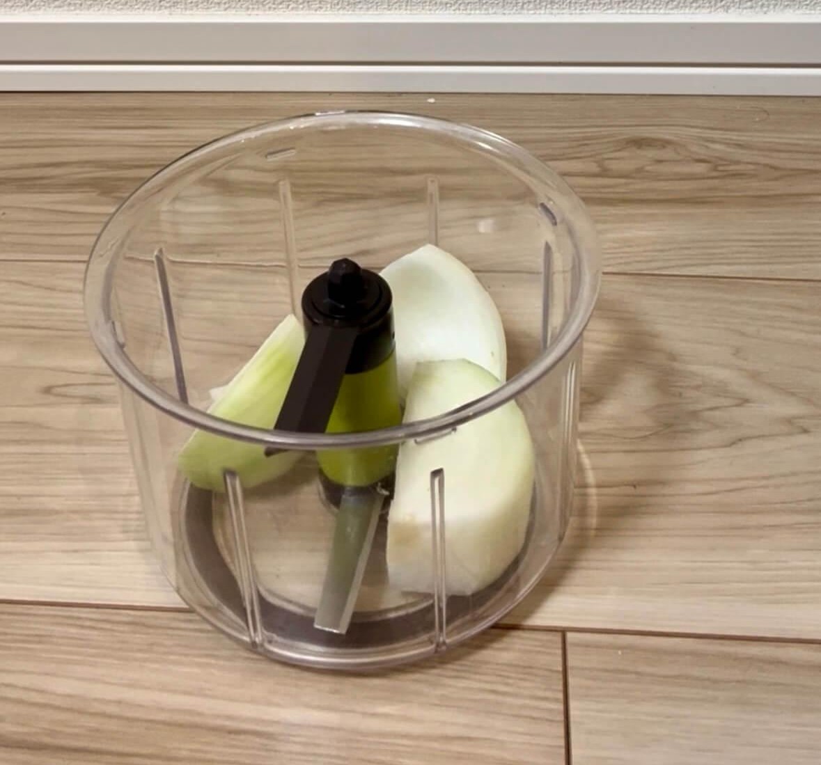試しに使った際に玉ねぎ1個を4等分にし容器に入れたところ、玉ねぎが大きすぎてハンドルが重くなかなか食材を切ることができませんでした。そのため玉ねぎを小さく切って容器に入れたところ、今度はハンドルも軽くだんだんとみじん切りになってきました。